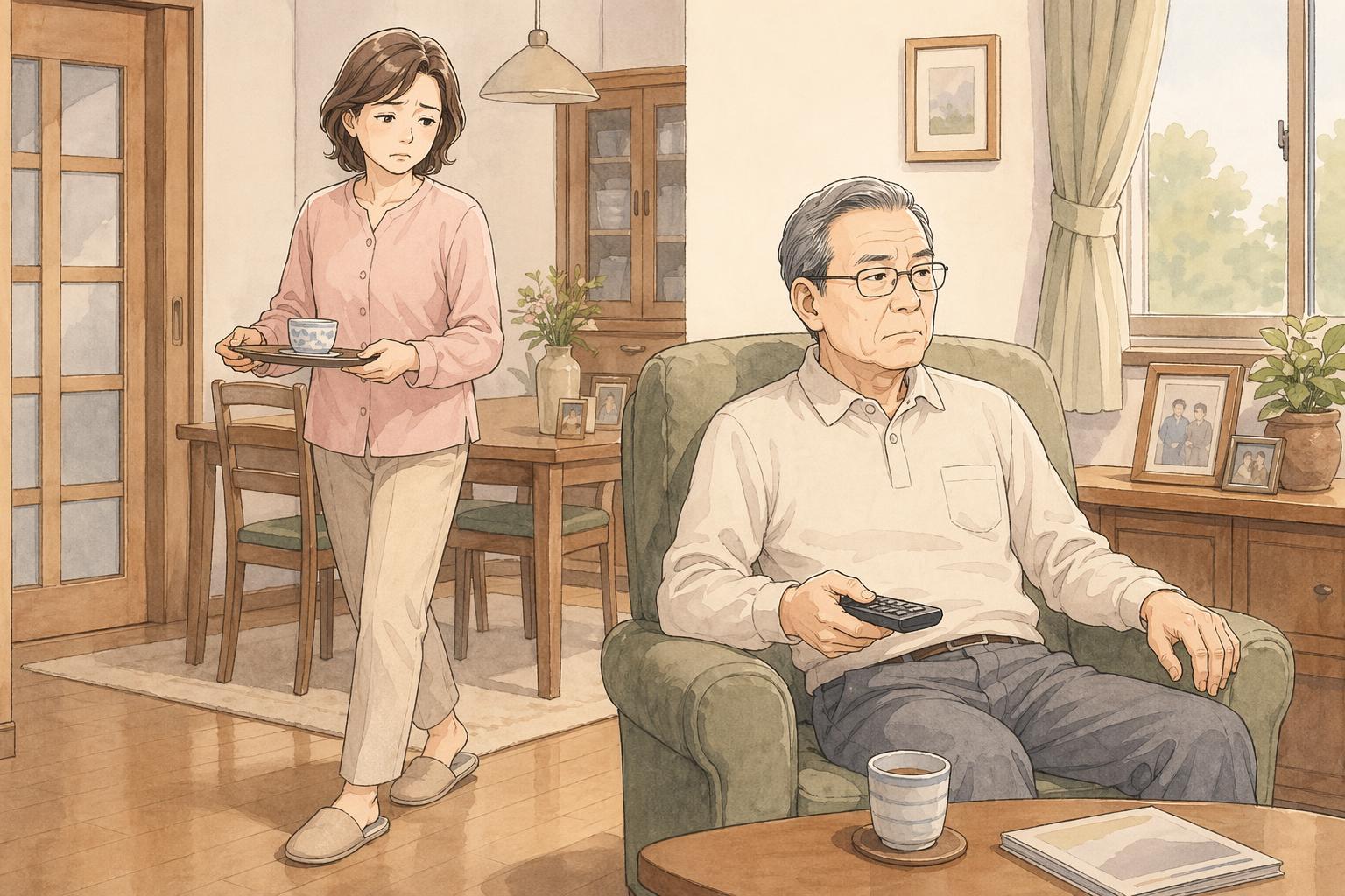 義母との同居は、どちらかというと「台所の支配権」「家事のやり方」「孫の育て方」といった、行動領域が重なることで摩擦が生まれます。一方で義父との同居は、もっと静かで、でも重い。食卓に座る場所、テレビのチャンネル、リビングのソファ、新聞、居間の空気そのものを支配されるような感覚です。