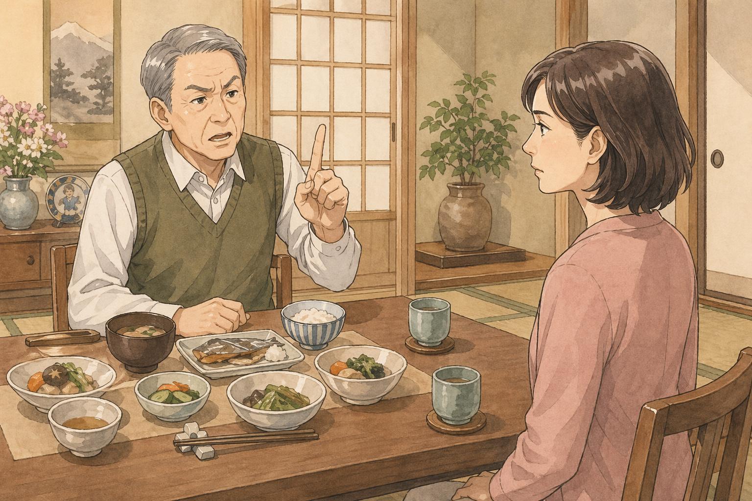 「最近ちょっと太ったね」「もうちょっと化粧したほうがいい」「共働きだと子どもがかわいそう」。評価する側の立場から物を言ってきます。あなたの人生を、義父の物差しで勝手に採点してくる構図ですね。こうした越境的な言動への線引きは、義父問題の核心の一つです。