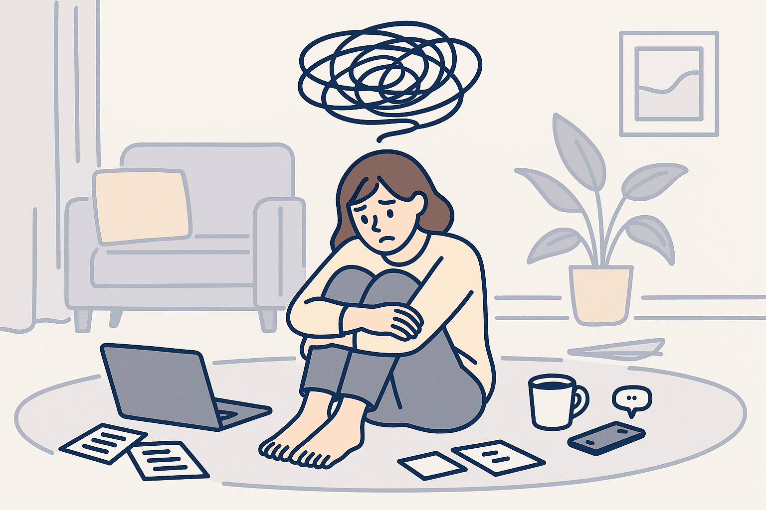 ぐるぐる思考が続くと、「また同じこと考えてる…」「私って面倒くさいな」など、自分を責める気持ちがだんだん強くなってしまいます。何度も同じ場面を思い返したり、言葉を反芻しているうちに、気づけば「私が悪いのかも」と結論づけてしまうことも。