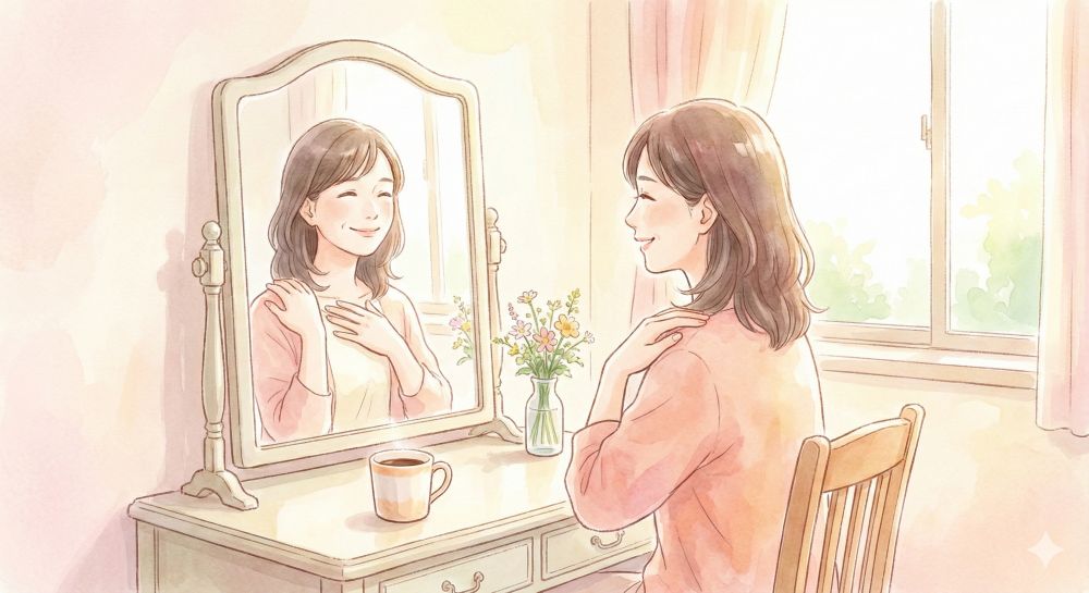 夜寝る前、鏡の中の自分に向かって「今日もおつかれさま」「よくやったね」と声をかける。