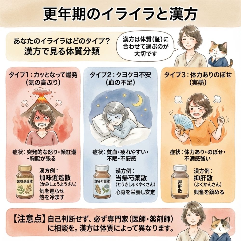 比較的体力があり、のぼせや不満感が強く、胃腸が丈夫な方は、興奮を鎮めることを目的とした漢方が候補になることもあります。
