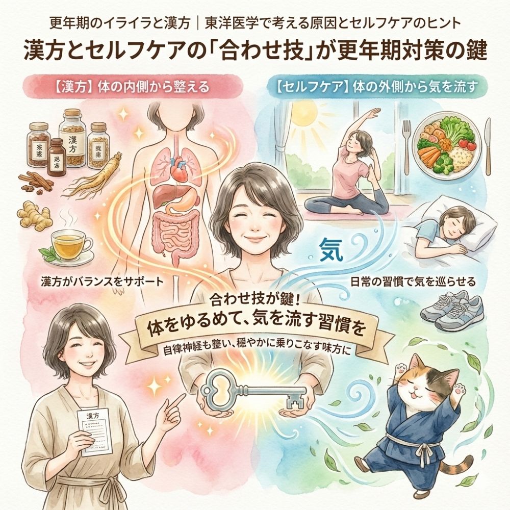 漢方薬に頼るだけでなく、体の外側から「気」の流れを意識的に整えるセルフケアを並行して行うことが、更年期の揺らぎを穏やかに乗りこなすための強い味方になってくれるでしょう。
