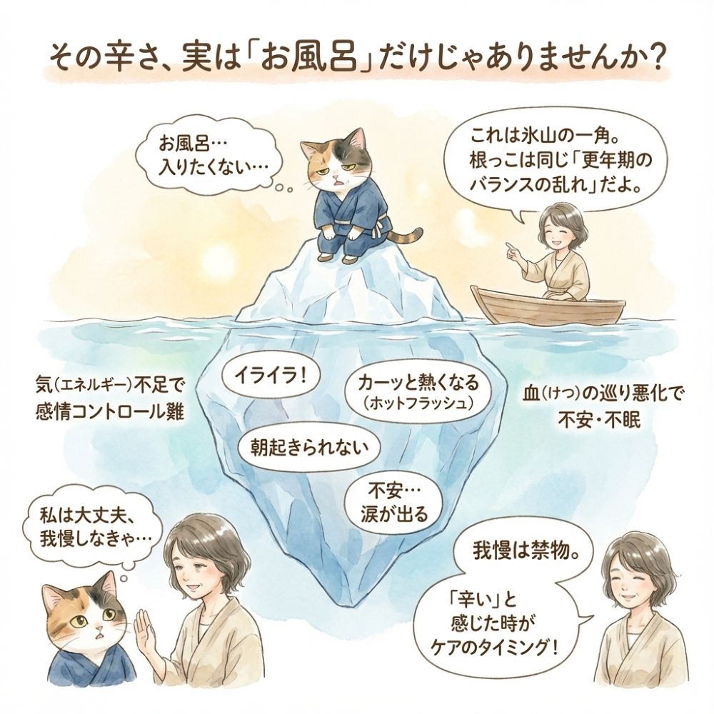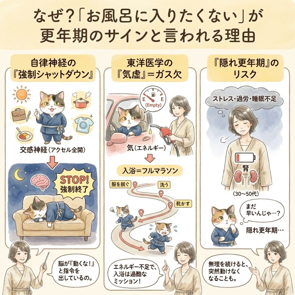 その「お風呂に入れない」という感覚は、身体が発している「これ以上動かないで!」という緊急停止のサイン、つまり更年期特有のゆらぎである可能性が高いのです。
