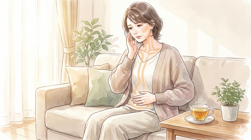 つまり、胃腸の調子が悪いと、お腹だけでなく、顔のトラブル(吹き出物やたるみ)や、足の前側の重だるさとして現れることがあるのです。