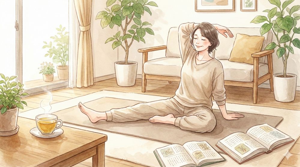 激しい運動をする必要はありません。呼吸に合わせてゆったりと体を動かし、経絡を心地よく刺激するストレッチを行うことで、気血水の流れがスムーズになり、心身のバランスが整っていきます。