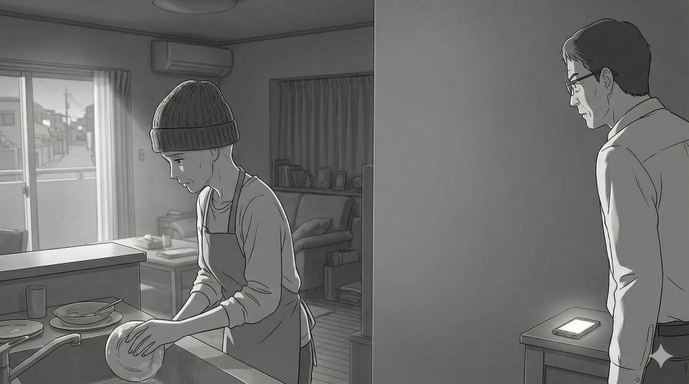 洗面所の鏡の前で、私はそっとニット帽を深く被り直した。鏡の中にいるのは、抗がん剤治療の影響ですっかり髪を失った50代の私。