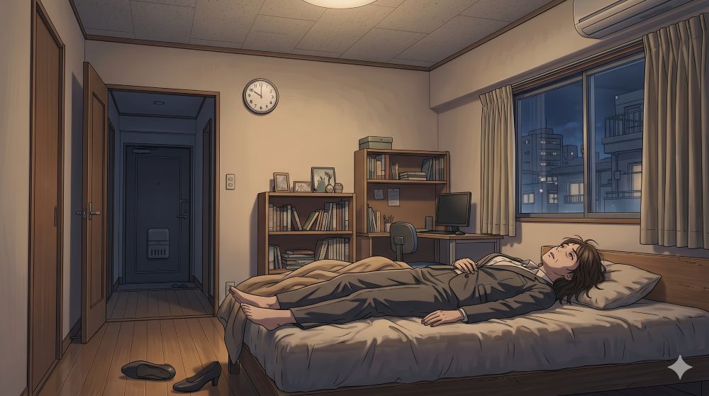重い玄関のドアを閉めた瞬間、残っていたわずかなエネルギーが完全に底を突いた。靴を脱ぎ捨て、着替える気力もないまま、スーツ姿でベッドに倒れ込む。見慣れた天井の模様をぼんやりと見つめていると、静寂の中で時間だけが容赦なく過ぎていく。